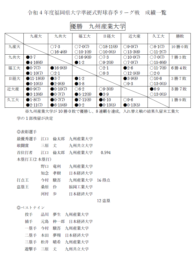 【福岡県大学】令和4(2022)年度 春季リーグ戦 成績 2025年4月30日2022年5月24日 令和4年度福岡県大学準硬式野球春季リーグ戦 成績一覧を一部訂正しファイルを差し替えましたので再度ご確認ください。 令和4年度福岡県大学準硬式野球春季リーグ戦 成績一覧です。既にダウンロード済みでしたら、ファイルの差し替えをお願いいたします。画像をクリックするとPDFが開きます。(2頁あります。) . クリックして印刷 (新しいウィンドウで開きます) 印刷 Tweetいいね:いいね 読み込み中… 関連